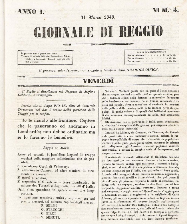 Francesco Selmi participated in the 1848 uprisings against Austrian rule. That same year, he founded the Giornale di Reggio to incite the population of the Austro-Este Duchy to revolt against Austrian occupation. After the defeat of the Piedmontese army at Custoza, he fled to Turin and was later sentenced to death in absentia by Francis V of Austria-Este, Duke of Modena and Reggio. With the help of his wife Marietta, he helped many patriots flee the duchy and take refuge in Turin. In 1859, he, along with Giuseppe Verdi, was among the promoters of the accession of the province of Modena to the Kingdom of Savoy.